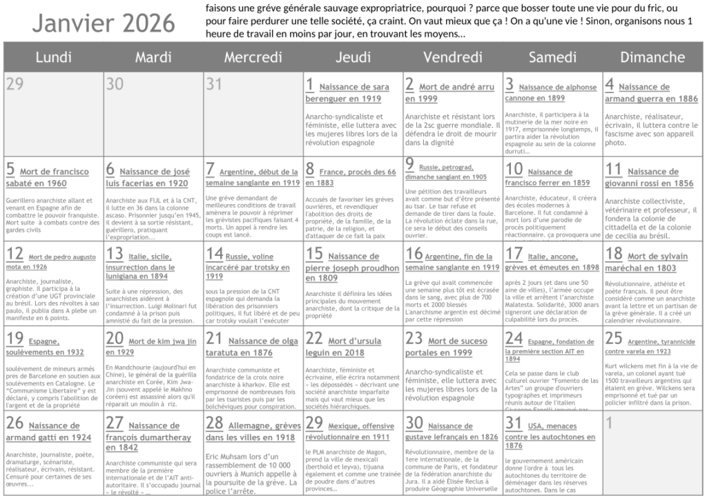 - En janvier, faisons une gréve générale sauvage expropriatrice, pourquoi ? parce que bosser toute une vie pour du fric, ou pour faire vivre des parasites milliardaires ou moindre, ça craint. On vaut mieux que ça ! On a qu’une vie ! Sinon, organisons nous 1 heure de travail en moins par jour, en trouvant des subterfuges…